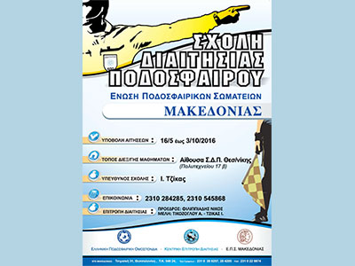Από την ΕΠΣ Μακεδονίας ανακοινώνεται ότι η Επιτροπή Διαιτησίας της Ένωσης, σε συνεργασία με το Σύνδεσμο Διαιτητών Ποδοσφαίρου Θεσσαλονίκης, θα λειτουργήσει Σχολή Διαιτησίας για την ανάδειξη νέων διαιτητών, η οποία αναμένεται να ξεκινήσει την Τρίτη 4 Οκτωβρίου 2016 και ώρα 20.30 στην αίθουσα διαλέξεων του Σ.Δ.Π.Θ. (Πολυτεχνείου 17 Β, 3ος όροφος).